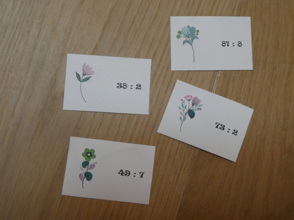 Ce jeu a été créé pour les élèves qui ont de la difficulté à comprendre la division avec reste. L’idée de former des groupes hétérogènes et d’utiliser ce jeu en début de thème. Le joueur doit effectuer de tête une division. Le reste définit quel joueur obtient la carte. Tous les joueurs sont actifs dans ce jeu, car à chaque tirage de carte, n’importe quel joueur peut remporter la carte. Ce jeu amène beaucoup d’échange sur la division et ils sont souvent amenés à expliquer et à justifier le reste.